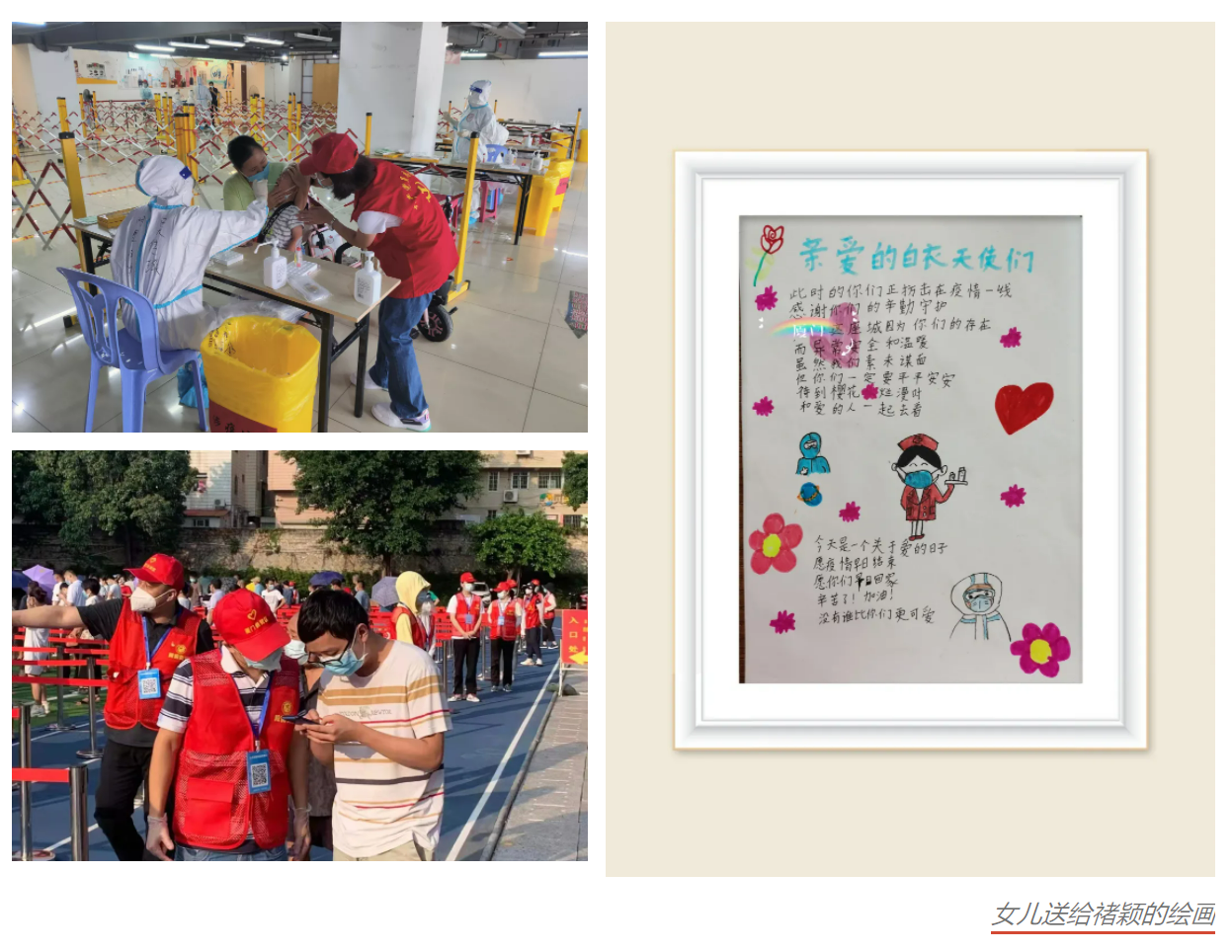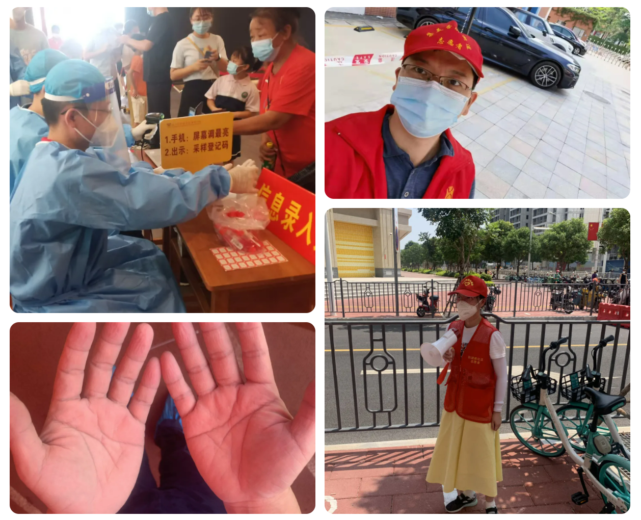 來自象嶼速傳黨辦的禇穎與她愛人更是雙方齊上陣,兩人錯開時間進(jìn)行志愿服務(wù),一人在外幫助市民進(jìn)行核酸檢測,一人在家照顧孩子,既顧好“小家”也顧著“大家”。當(dāng)她完成志愿者任務(wù),給女兒看了自己的照片后,女兒忽閃忽閃的大眼睛直直地看著媽媽說:“媽媽,真不容易,應(yīng)該很熱吧!”夫妻二人用親身經(jīng)歷給孩子樹立了一個好榜樣!